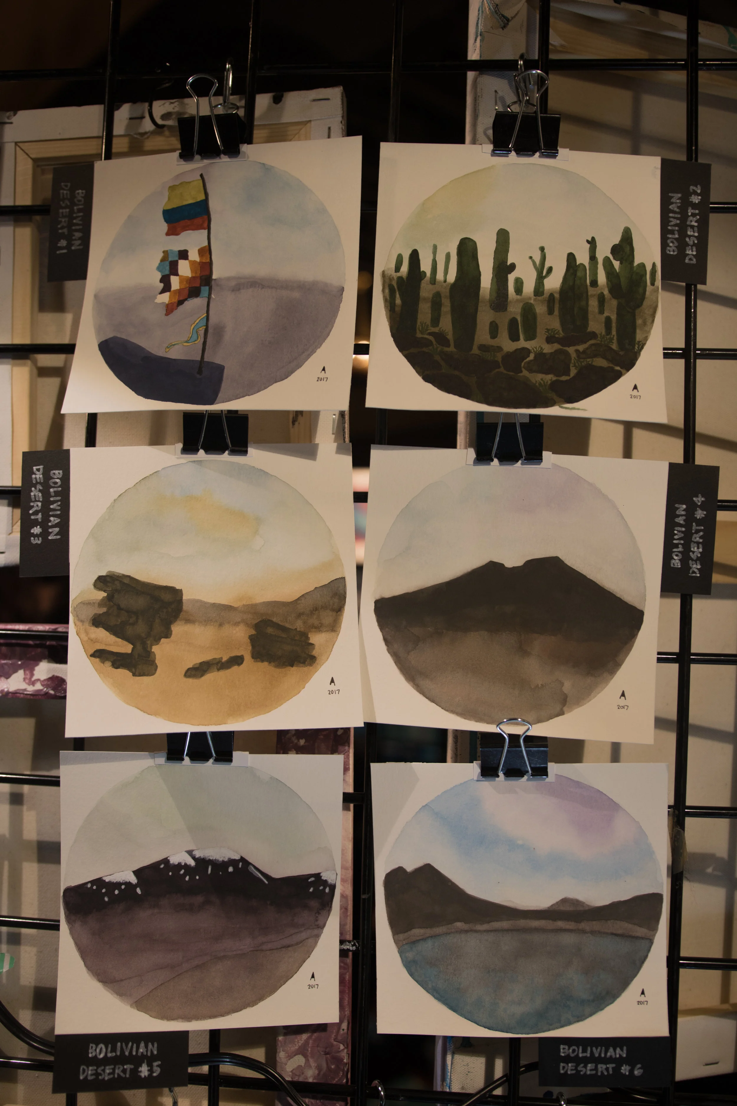 "abstract watercolors", "bolivian desert", and "NYC buildings" series from the left to the right